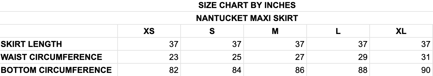 Nantucket Maxi Skirt Available in 2 colors from $68.99 Blue / XS — $68.99 Blue / S — $68.99 Blue / M — $68.99 Blue / L — $68.99 Blue / XL — $68.99 Pink / XS — $68.99 Pink / S — $68.99 Pink / M — $68.99 Pink / L — $68.99 Pink / XL — $68.99 Add to Cart